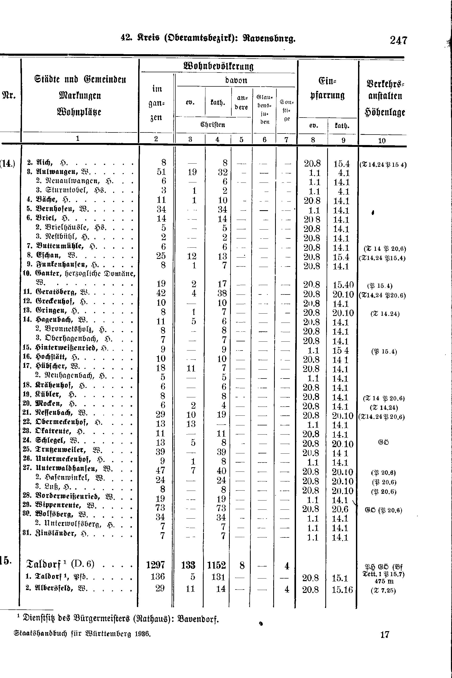 Wohnbevölkerung | Einpfarrung | Verkehrs-anstalten Höhenlage | ||||||