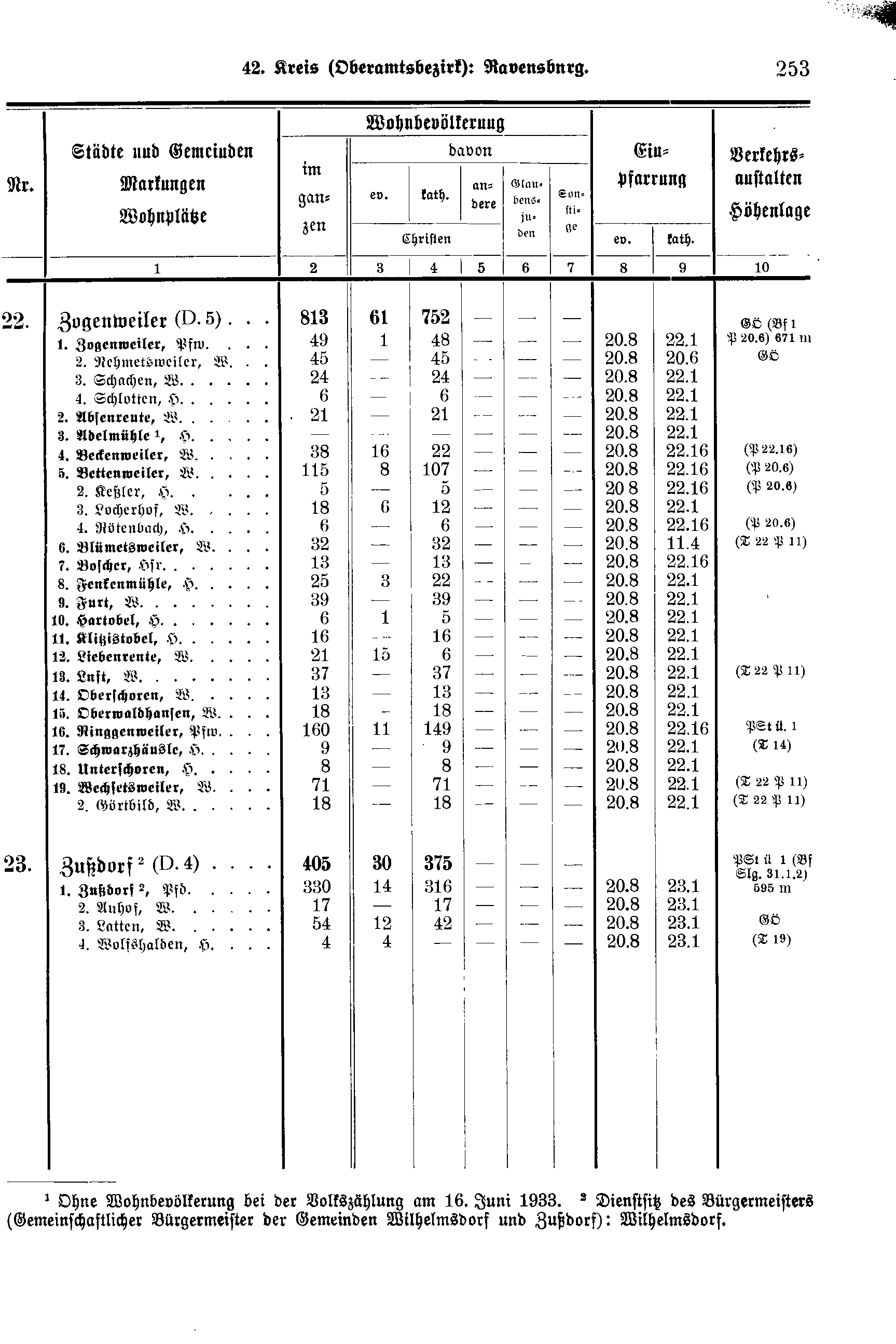 1. Ohne Wohnbevölkerung bei der Volkszählung am 16. Juni 1933.