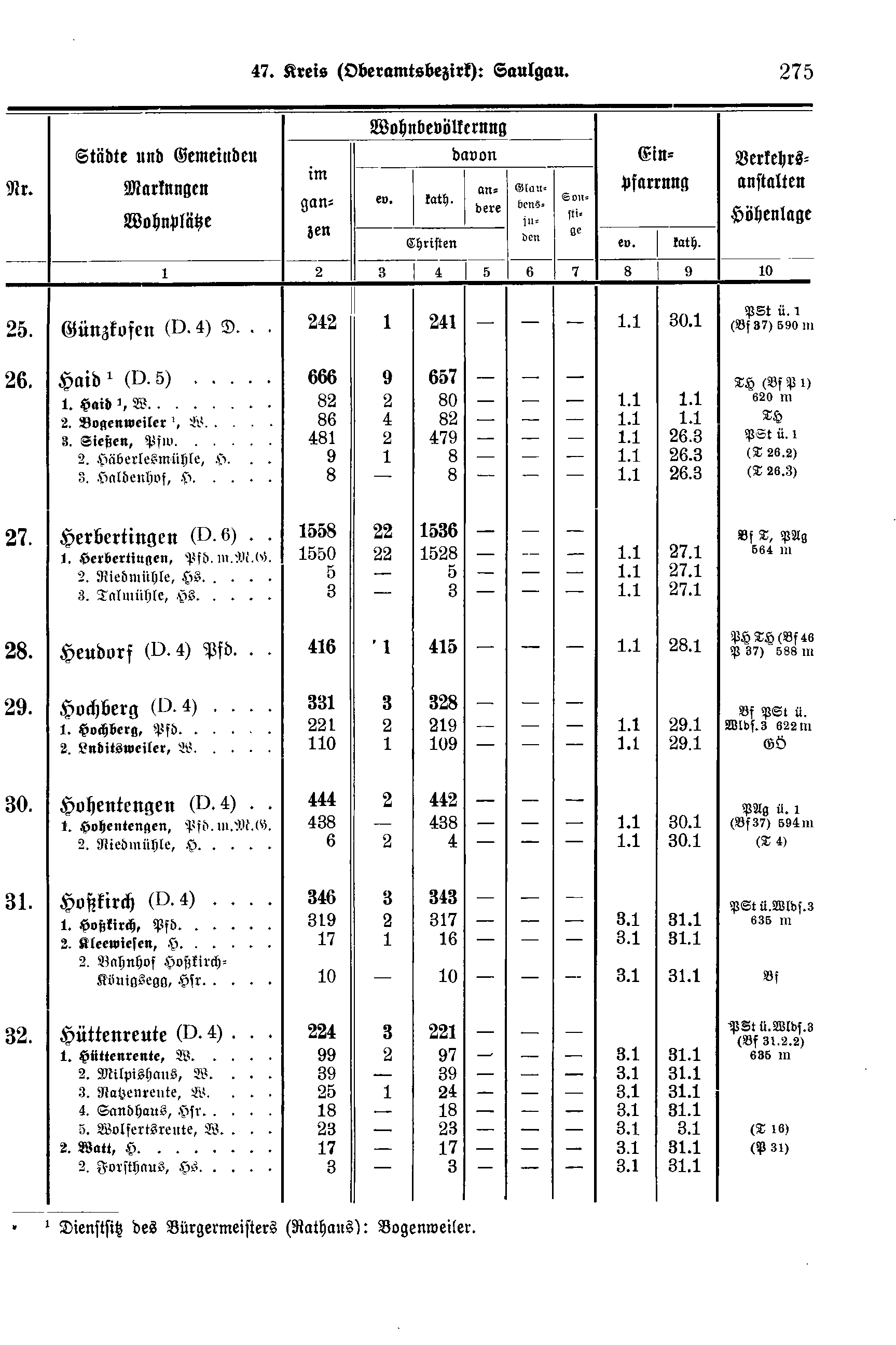 Wohnbevölkerung | Einpfarrung | Verkehrs-anstalten Höhenlage | ||||||