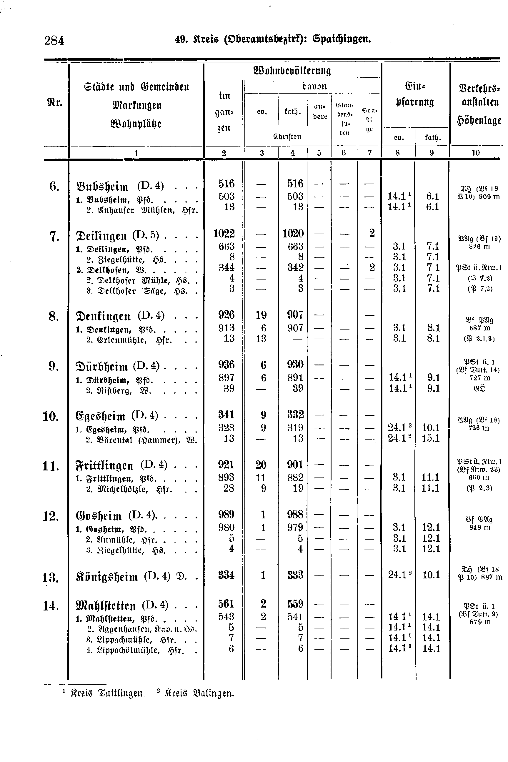 Wohnbevölkerung | Einpfarrung | Verkehrs-anstalten Höhenlage | ||||||