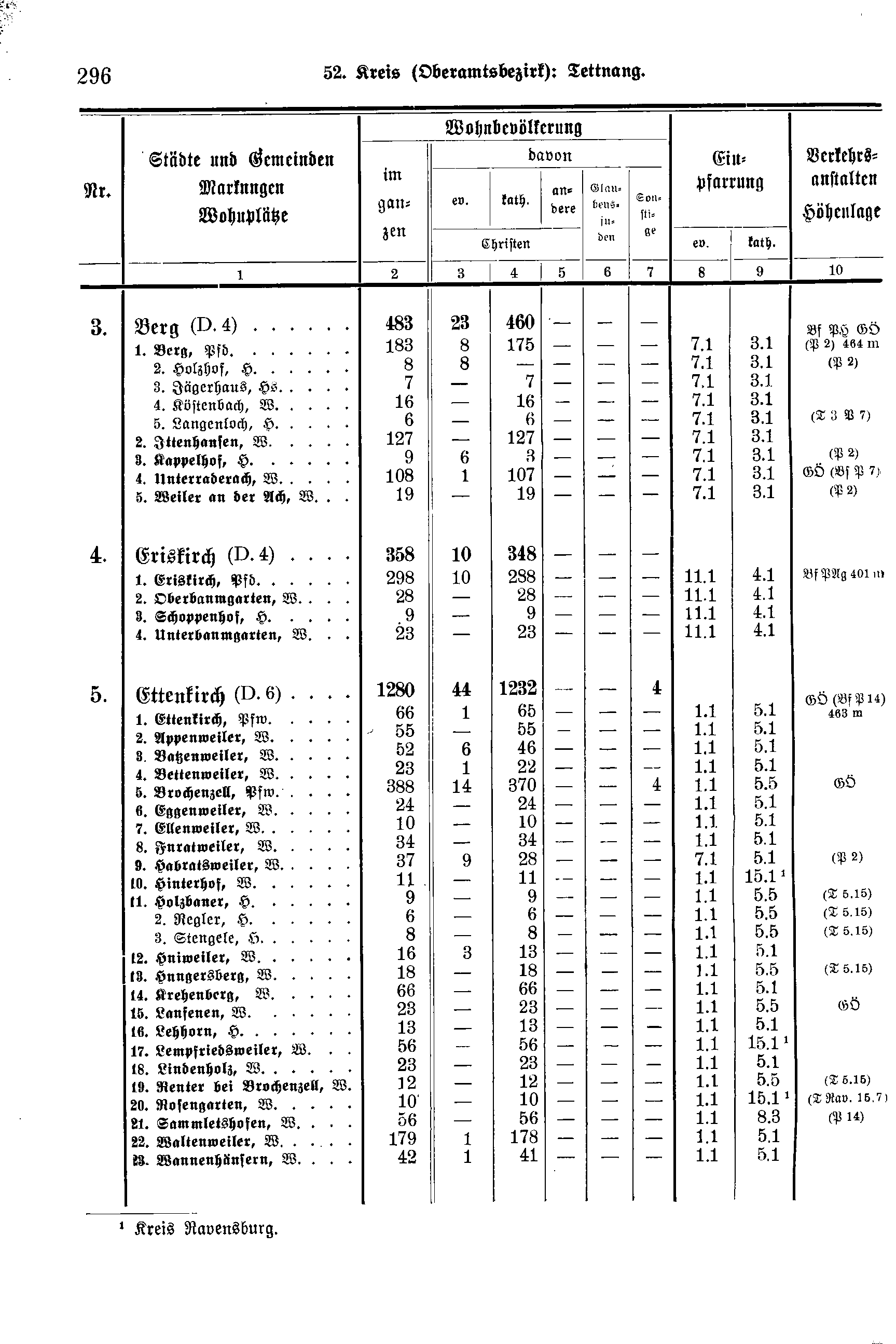 Wohnbevölkerung | Einpfarrung | Verkehrs-anstalten Höhenlage | ||||||