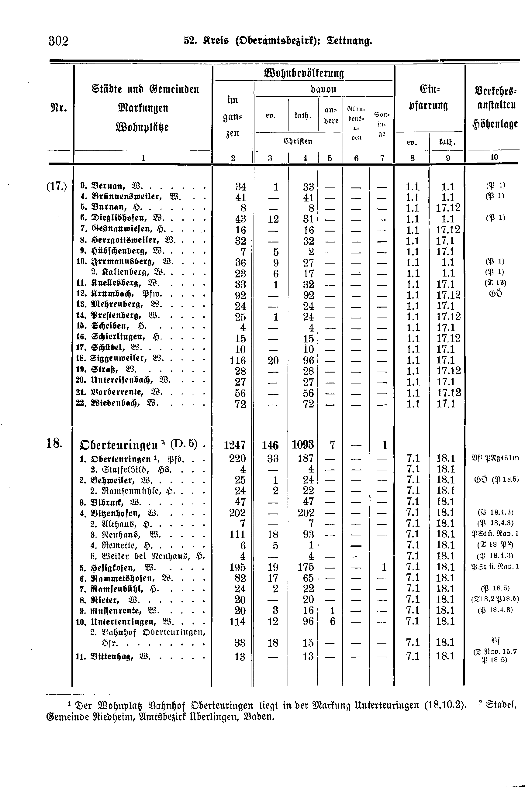Wohnbevölkerung | Einpfarrung | Verkehrs-anstalten Höhenlage | ||||||