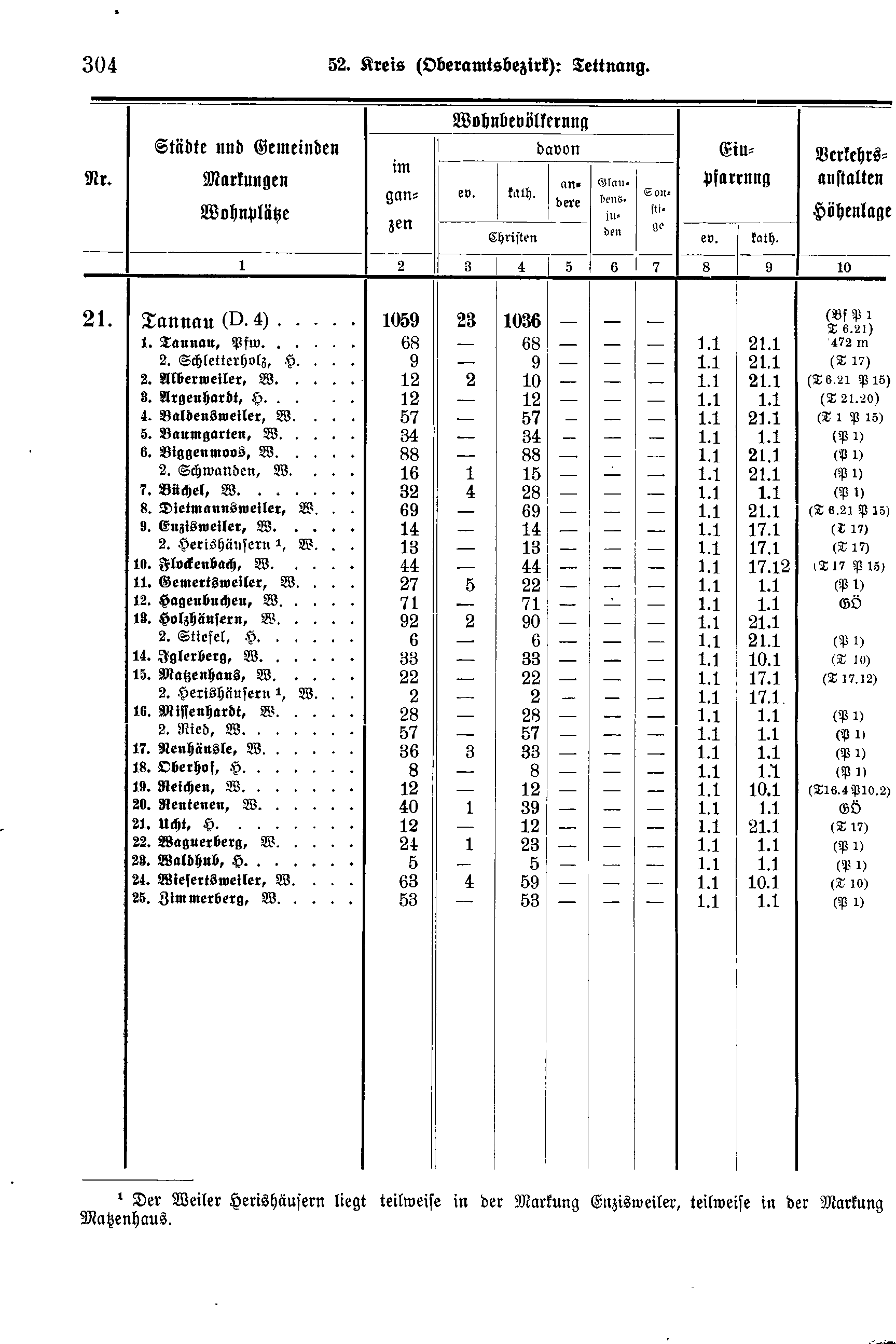 Wohnbevölkerung | Einpfarrung | Verkehrs-anstalten Höhenlage | ||||||