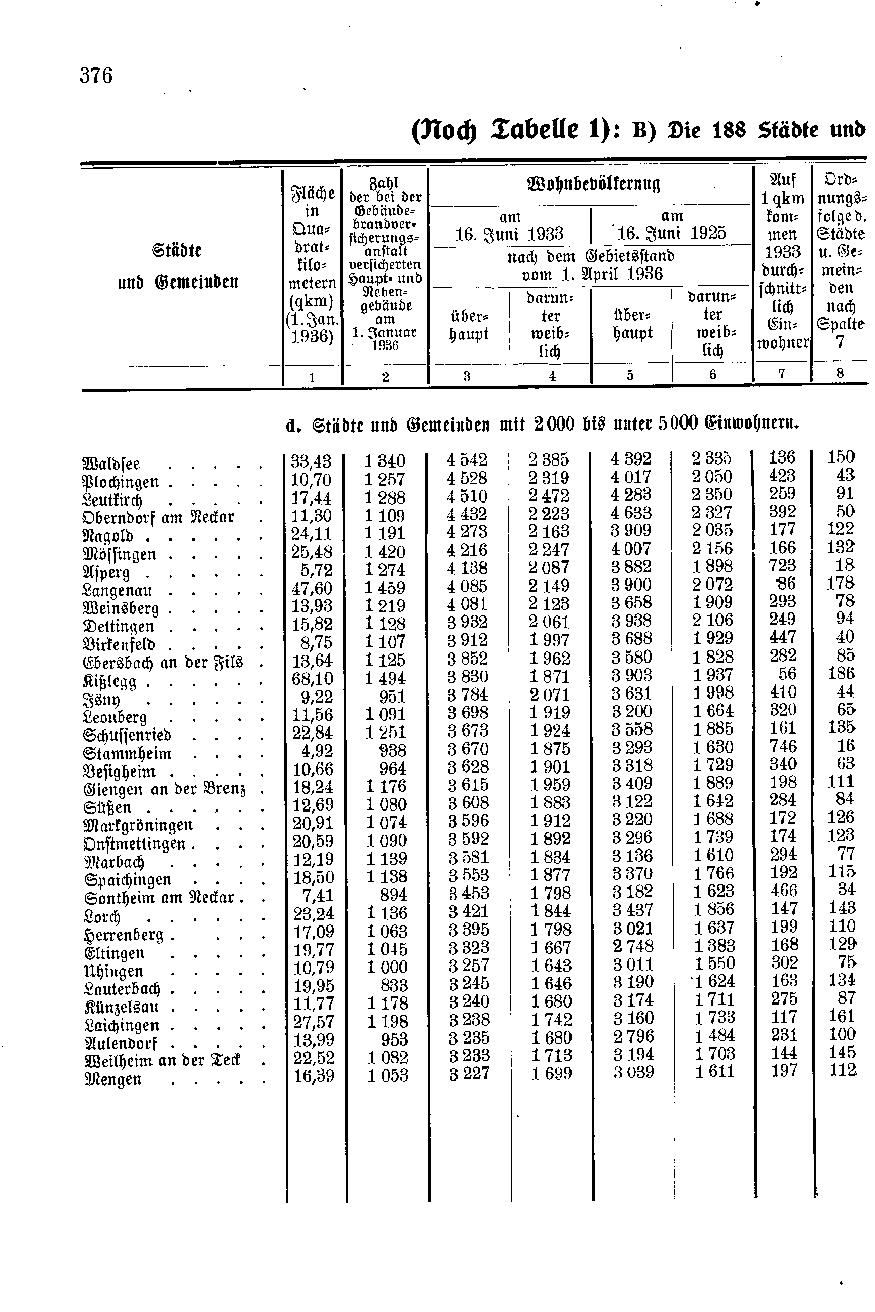 (Noch Tabelle 1): B) die 188 Städte und Gemeinden mit 2000 und mehr Einwohnern.
