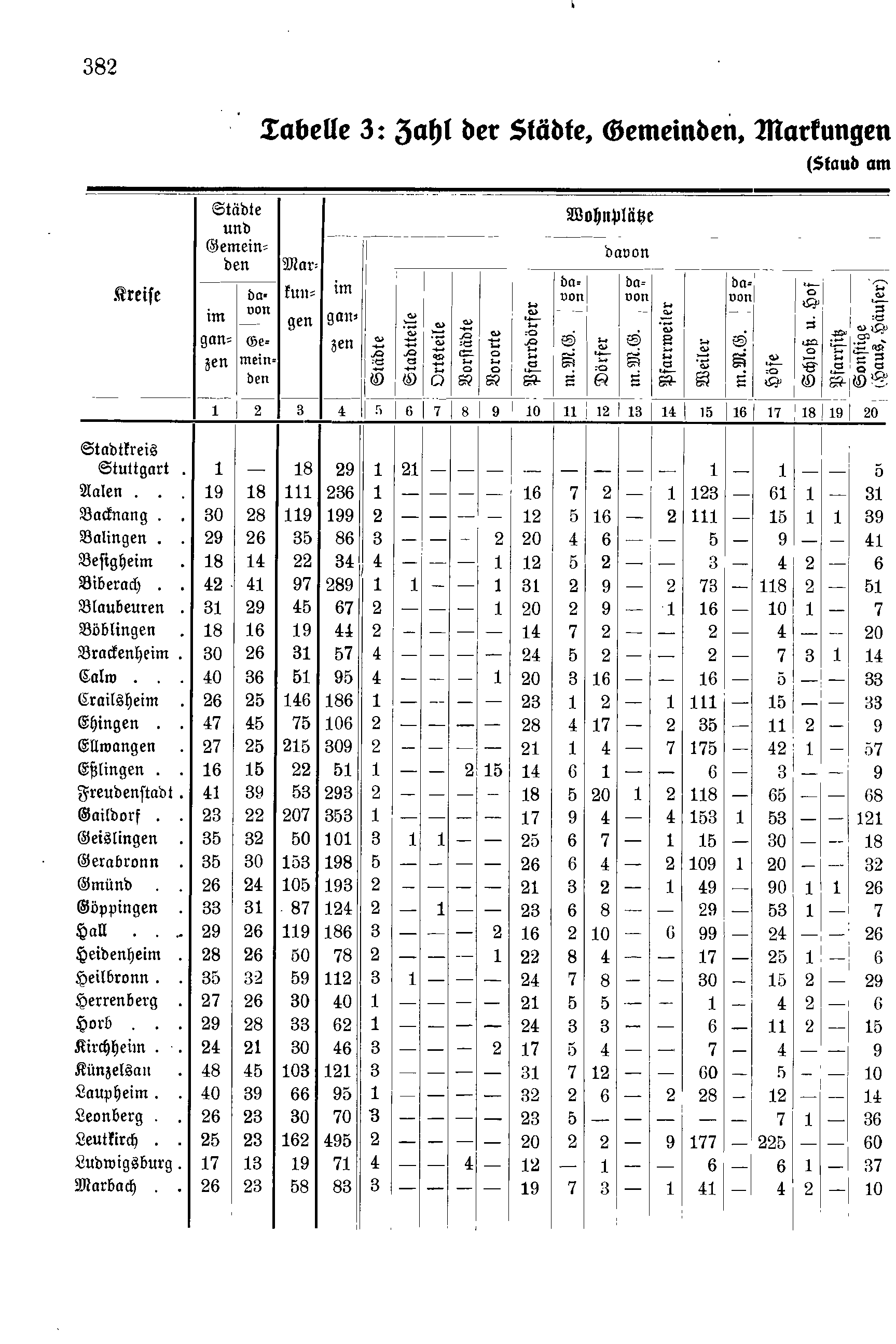 Tabelle 3: Zahl der Städte, Gemeinden, Markungen und Wohnplätze nach Kreisen (Oberamtsbezirken).