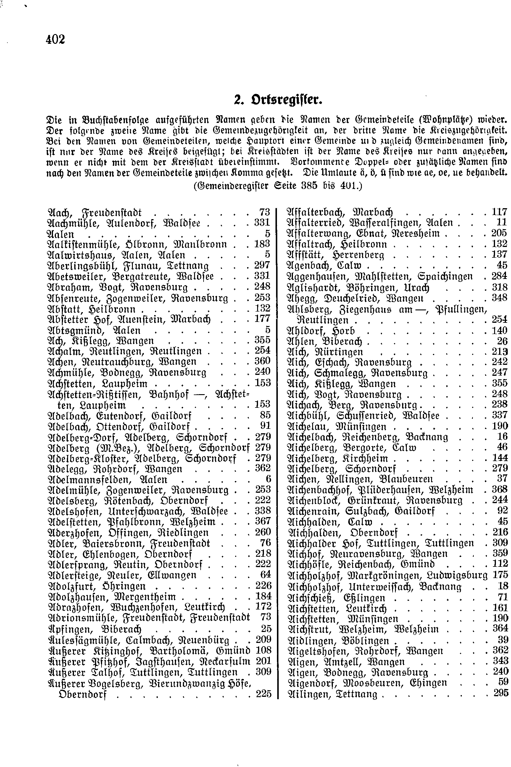 Die in Buchstabenfolge aufgeführten Namen geben die Namen der Gemeindeteile (Wohnplätze) wieder. Der folgende zweite Name gibt die Gemeindezugehörigkeit an, der dritte Name die Kreiszugehörigkeit. Bei den Namen von Gemeindeteilen, welche Hauptort einer Gemeinde und zugleich Gemeindenamen sind,ist nur der Name des Kreises beigefügt; bei Kreisstädten ist der Name des Kreises nur dann angegeben, wenn er nicht mit dem der Kreisstadt übereinstimmt. Vorkommende Doppel- oder zusätzliche Namen sind nach den Namen der Gemeindeteile zwischen Komma gesetzt. Die Umlaute ä,ö,ü sind wie ae, oe, ue behandelt.