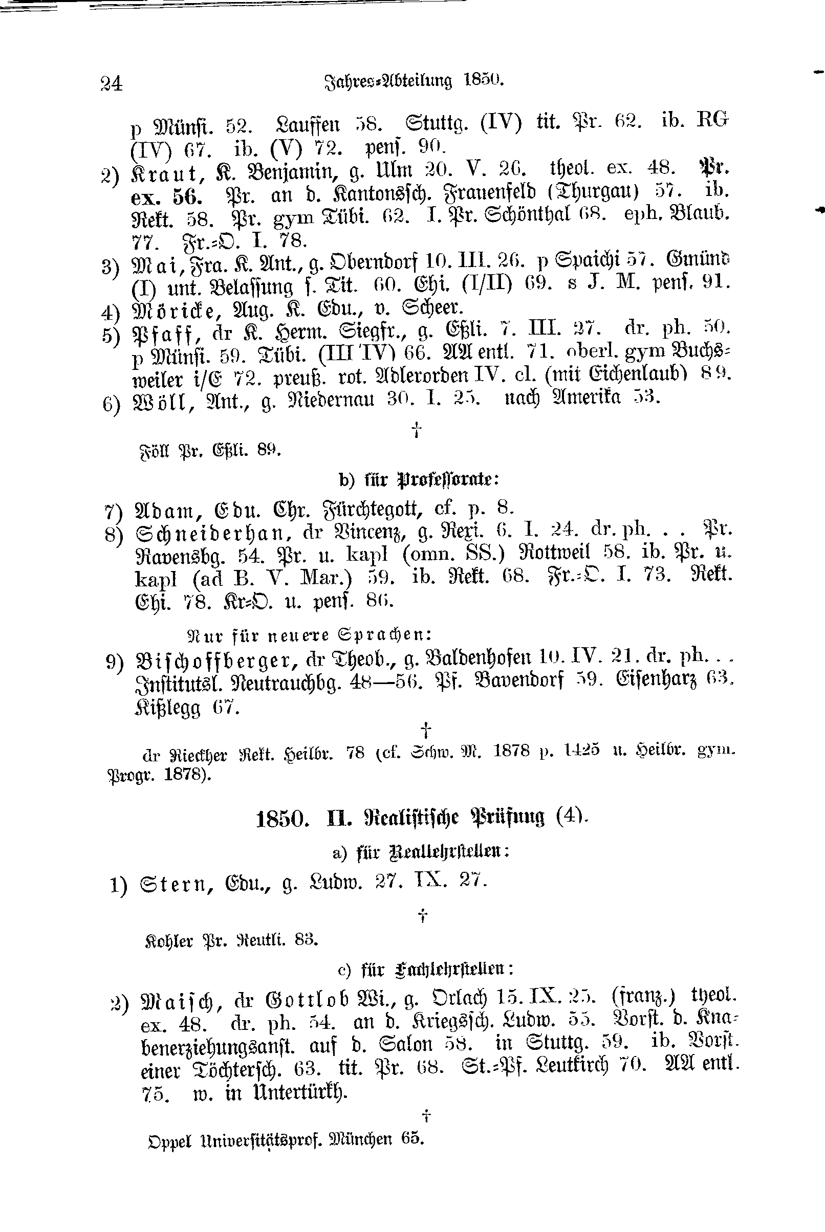 | 2) | Maisch, dr Gottlob Wi., g. Orlach 15. IX. 25. (franz.) theol. ex. 48. dr. ph. 54 an d. Kriegssch. Ludw. 55. Vorst. d. Knabenerziehungsanst. auf d. Salon 58. in Stuttg. 59. ib. Vorst. einer Töchtersch. 63. tit. Pr. 68. St.-Pf. Leutkirch 70. AA entl. 75. w. in Untertürkh. |