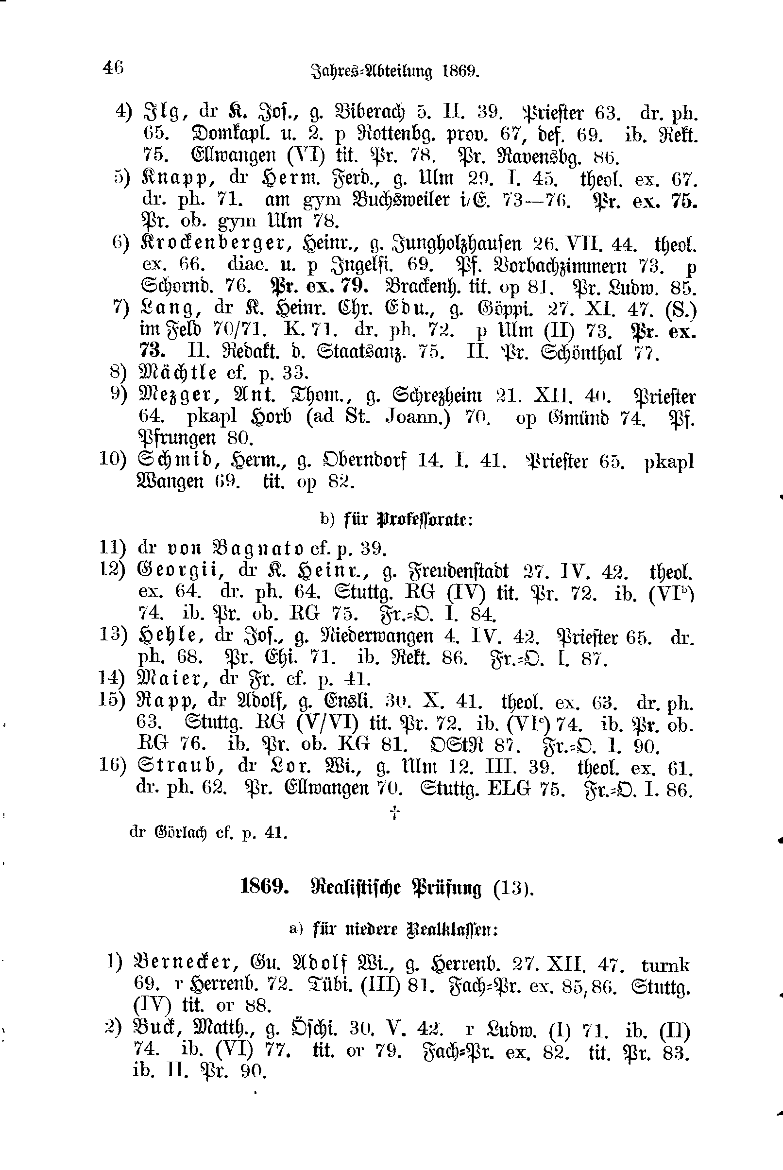| 5) | Knapp, dr Herm. Ferd., g. Ulm 29. I. 45. theol. ex. 67. dr. ph. 71. am gym Buchsweiler i/E. 73-76. Pr. ex. 75. Pr. ob. gym Ulm 78. |