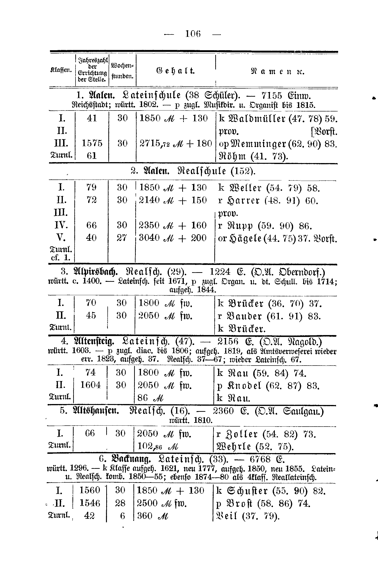 | 4. Altensteig. Lateinsch. (47) - 2156 E. (O.A. Nagold) württ. 1608. - p zugl. diac. bis 1806; aufgeh. 1819, als Amtsverweserei wieder err. 1823, aufgeh. 37. Realsch. 37 - 67; wieder Lateinsch. 67. | ||||