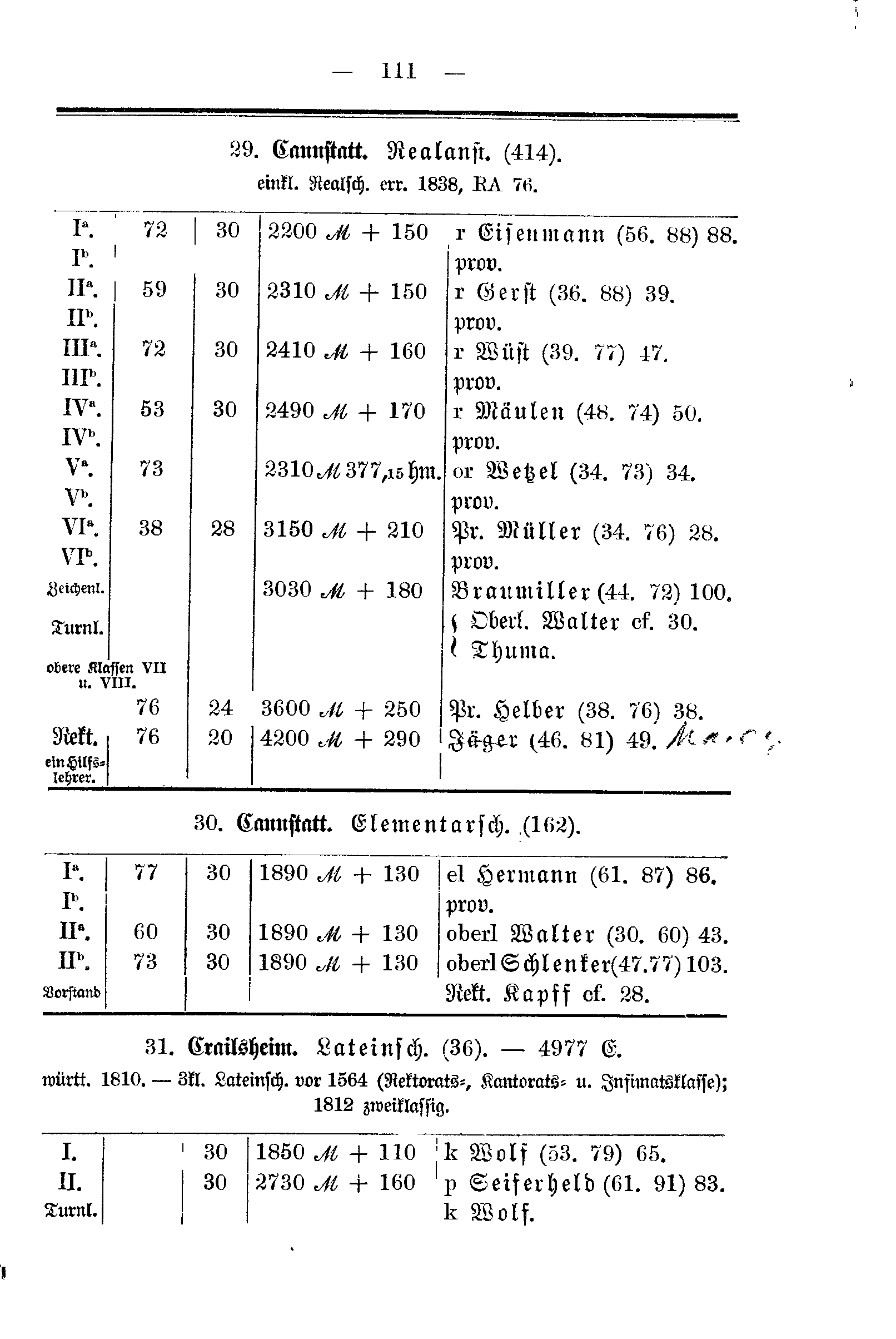 | 31.Crailsheim. Lateinsch. (36). - 4977 E. württ. 1810. - 3kl. Lateinsch. vor 1564 (Rektorats, Kantorats- u. Infimatsklasse); 1812 zweiklassig. | ||||