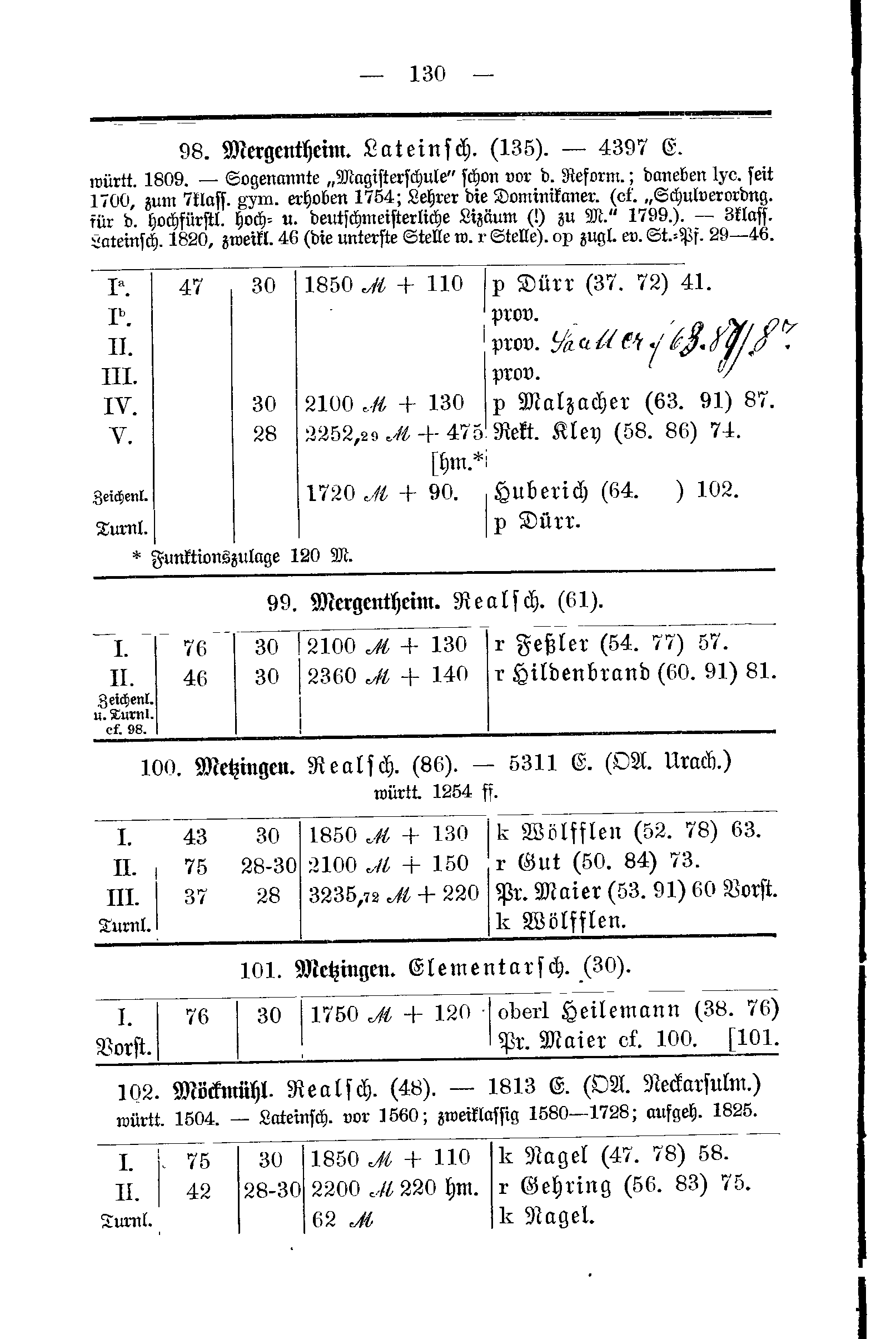 | 98.Mergentheim. Lateinsch. (135). - 4397 E. württ. 1809. - Sogenannte "Magisterschule" schon vor d. Reform.; daneben lyc.seit 1700, zum 7klass. gymn. erhoben 1754; Lehrer die Dominikaner. (cf."Schulverordng. für d. hochfürstl. hoch- u. deutschmeisterliche Lizäum(!) zu M."1799.). - 3klass. Lateinsch. 1820, zweikl. 46 (die unterste Stelle w. r Stelle). op zugl. ev. St.-Pf. 29 - 46. | ||||