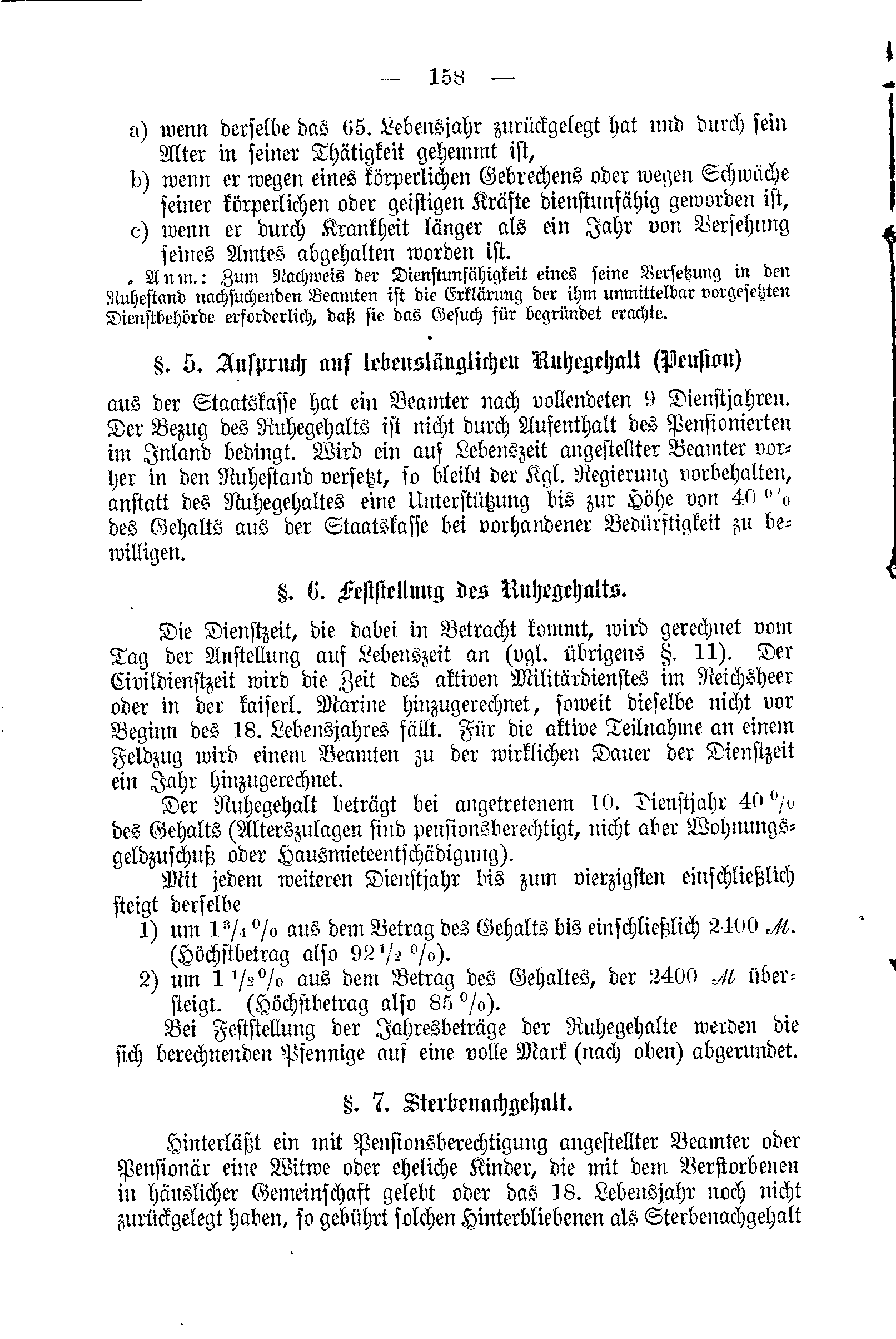 aus der Staatskasse hat ein Beamter nach vollendenten 9 Dienstjahren. Der BEzug des Rhegehalts ist nicht durch Aufenthalt des Pensionierten im Inland bedingt. Wird ein auf Lebenszeit angestellter Beamter vorher in den Ruhestand versetzt, so bleibt der Kgl. Regierung vorbehalten, anstatt des Ruhegehalts eine Unterstützung bis zur Höhe von 40% des Gehalts aus der Staatskasse bei vorhandener Bedürftigkeit zu bewilligen.
