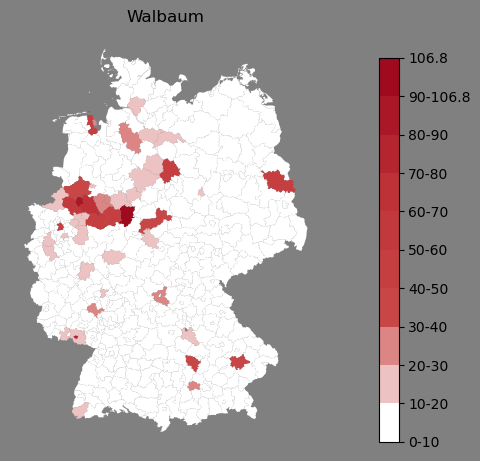 Relative Verteilung des Namens Walbaum (1996)Direkt zur Karte Die Farbskala zeigt die Anzahl von "Walbaum" bezogen auf je 1 Million Einträge. |
