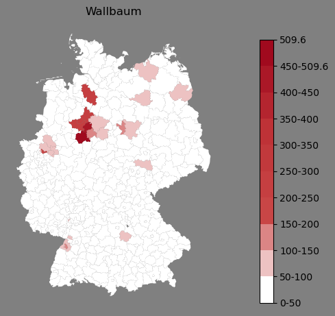 Relative Verteilung des Namens Wallbaum (1996)Direkt zur Karte Die Farbskala zeigt die Anzahl von "Wallbaum" bezogen auf je 1 Million Einträge. |