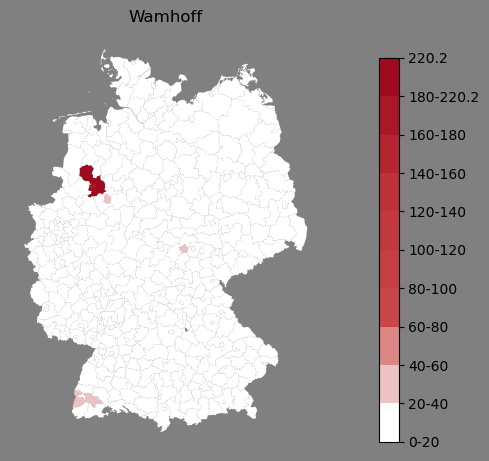 Relative Verteilung des Namens Wamhoff (1996)Direkt zur Karte Die Farbskala zeigt die Anzahl von "Wamhoff" bezogen auf je 1 Million Einträge. |