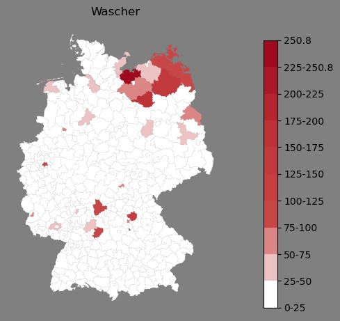 Relative Verteilung des Namens Wascher (1996)Direkt zur Karte Die Farbskala zeigt die Anzahl von "Wascher" bezogen auf je 1 Million Einträge. |