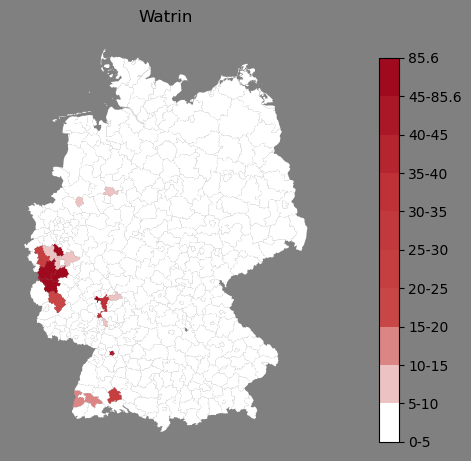 Relative Verteilung des Namens Watrin (1996)Direkt zur Karte Die Farbskala zeigt die Anzahl von "Watrin" bezogen auf je 1 Million Einträge. |