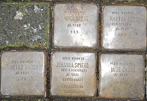 Der Kölner Künstler Gunter Demnig erinnert an Opfer des Nationalsozialismus, indem er vor ihrem letzten selbstgewählten Wohnort Gedenktafeln aus Messing in den Gehweg einlässt. Die Gedenktafeln haben eine Kantenlänge von etwa 10 cm. Sie werden Stolpersteine genannt.