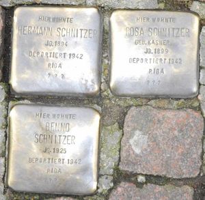 • hier wohnte Hermann Schnitzer, Jg. 1894, deportiert 1942, Riga, ???