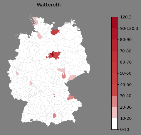 Relative Verteilung des Namens Watteroth (1996)Direkt zur Karte Die Farbskala zeigt die Anzahl von "Watteroth" bezogen auf je 1 Million Einträge. |
