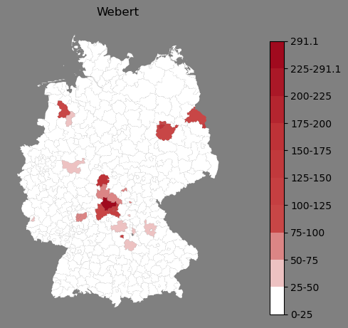 Relative Verteilung des Namens Webert (1996)Direkt zur Karte Die Farbskala zeigt die Anzahl von "Webert" bezogen auf je 1 Million Einträge. |