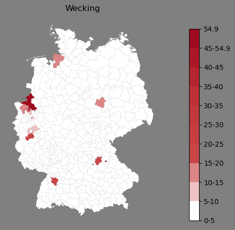 Relative Verteilung des Namens Wecking (1996)Direkt zur Karte Die Farbskala zeigt die Anzahl von "Wecking" bezogen auf je 1 Million Einträge. |