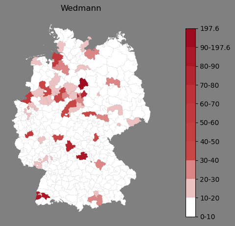 Relative Verteilung des Namens Wedmann (1996)Direkt zur Karte Die Farbskala zeigt die Anzahl von "Wedmann" bezogen auf je 1 Million Einträge. |