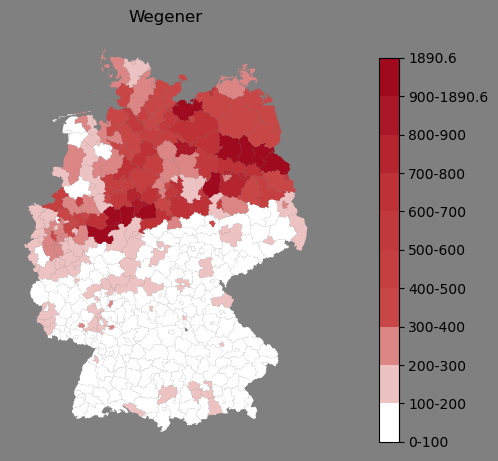 Absolute Verteilung des Namens Wegener (1890)Direkt zur Karte Absolute Verteilung des Namens "Wegener" um 1890 im damaligen Deutschen Reich Sie können die Karte innerhalb des Fensters zoomen und verschieben. |