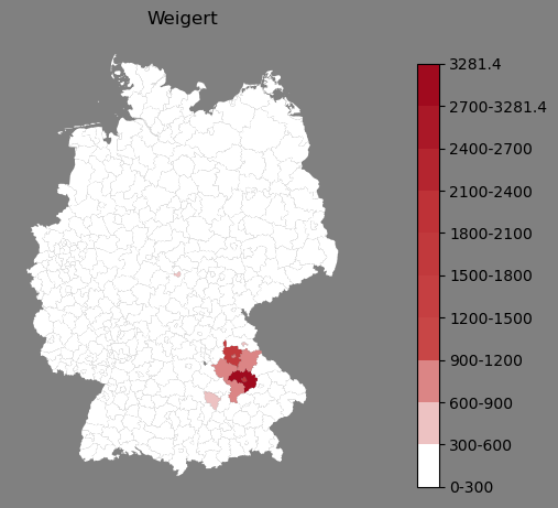 Relative Verteilung des Namens Weigert (1996)Direkt zur Karte Die Farbskala zeigt die Anzahl von "Weigert" bezogen auf je 1 Million Einträge. |