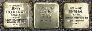- Hier wohnte Edith Gál, Jg. 1888, gedemütigt/entrechtet, Flucht in den Tod 1942