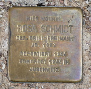 - Hier wohnte Rosa Schmidt, geb. Grill-Freimann, Jg. 1882, deportiert 1944, ermordet 1944 in Auschwitz