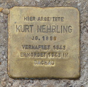 - Hier arbeitete Kurt Nehrling, Jg. 1899, verhaftet 1943, ermordet 1943 in Dachau