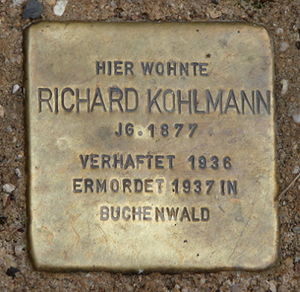 - Hier wohnte Richard Kohlmann, Jg. 1877, verhaftet 1936, ermordet 1937 in Buchenwald