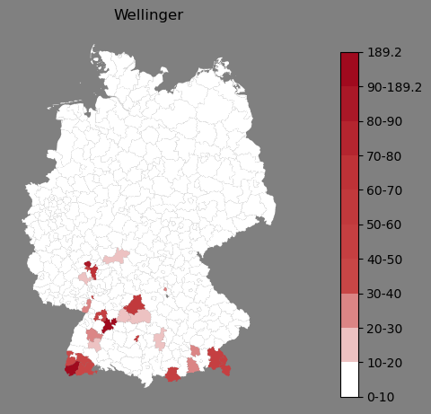 Relative Verteilung des Namens Wellinger (1996)Direkt zur Karte Die Farbskala zeigt die Anzahl von "Wellinger" bezogen auf je 1 Million Einträge. |