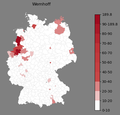 Relative Verteilung des Namens Wemhoff (1996)Direkt zur Karte Die Farbskala zeigt die Anzahl von "Wemhoff" bezogen auf je 1 Million Einträge. |