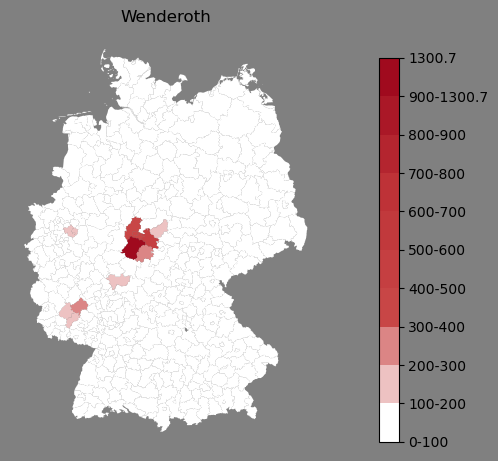 Relative Verteilung des Namens Wenderoth (1996)Direkt zur Karte Die Farbskala zeigt die Anzahl von "Wenderoth" bezogen auf je 1 Million Einträge. |