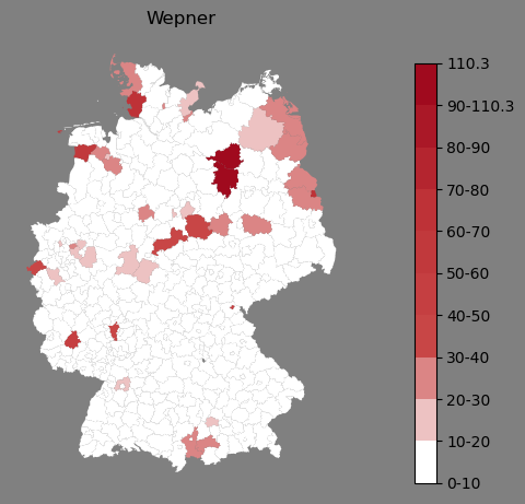 Absolute Verteilung des Namens Wepner (1890)Direkt zur Karte Absolute Verteilung des Namens "Wepner" um 1890 im damaligen Deutschen Reich Sie können die Karte innerhalb des Fensters zoomen und verschieben. |