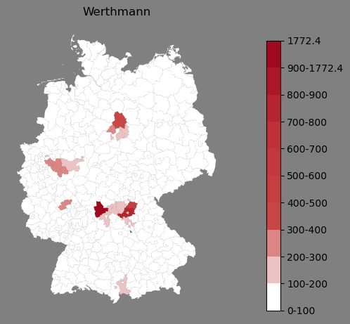 Relative Verteilung des Namens Werthmann (1996)Direkt zur Karte Die Farbskala zeigt die Anzahl von "Werthmann" bezogen auf je 1 Million Einträge. |