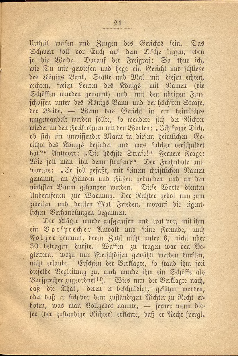 Urtheil weisen und Zeugen des Gerichts sein. Das Schwert soll vor Euch auf dem Tische liegen, eben so die Weide. Darauf der Freigraf: So thue ich, wie Du mir gewiesen und hege ein Gericht und schließe des Königs Bank, Stätte und Mal mit diesen echten, rechten, freien Leuten des Königs mit Namen (die Schöffen wurden genannt) und mit den übrigen Femschöffen unter des Königs Bann und der höchsten Strafe, der Weide. – Wenn das Gericht in ein heimliches umgewandelt werden sollte, so wendete sich der Richter wieder an den Freifrohnen mit den Worten: „Ich frage Dich, ob sich ein unwissender Mann in diesem heimlichen Gerichte des Königs befindet und was solcher verschuldet hat?“ Antwort: „Die höchste Strafe!“ Fernere Frage: „[GWR 1]Wie soll man ihn denn strafen?“ Der Frohnbote antworte: „Er soll gefaßt, mit seinem christlichen Namen genannt, an Händen und Füßen gebunden und an den nächsten Baum gehangen werden.“[GWR 2] Diese Worte dienten Unberufenen zur Warnung. Der Richter gebot nun zum zweiten und dritten Mal Frieden, worauf die eigentlichen Verhandlungen begannen.