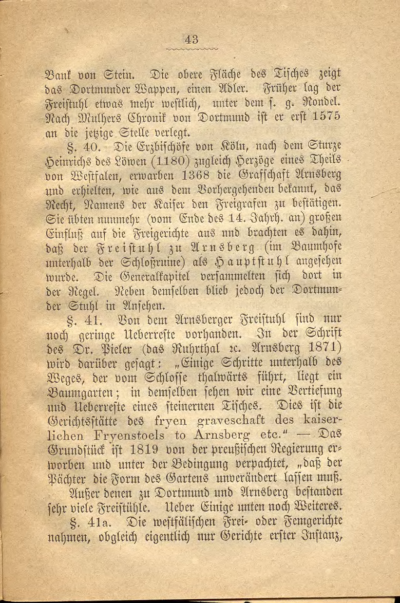 § 40. Die Erzbischöfe von Köln, nach dem Sturze Heinrichs des Löwen (1180) zugleich Herzöge eines Theils von Westfalen, erwarben 1368 die Grafschaft Arnsberg und erhielten, wie aus dem Vorhergehenden bekannt, das Recht, Namens der Kaiser den Freigrafen zu bestätigen. Sie übten nunmehr (vom Ende des 14. Jahrh. an) großen Einfluß auf die Freigerichte aus und brachten es dahin, daß der Freistuhl zu Arnsberg (im Baumhofe unterhalb der Schloßruine) als Hauptstuhl angesehen wurde. Die Generalkapitel versammelten sich dort in der Regel. Neben demselben blieb jedoch der Dortmunder Stuhl in Ansehen.