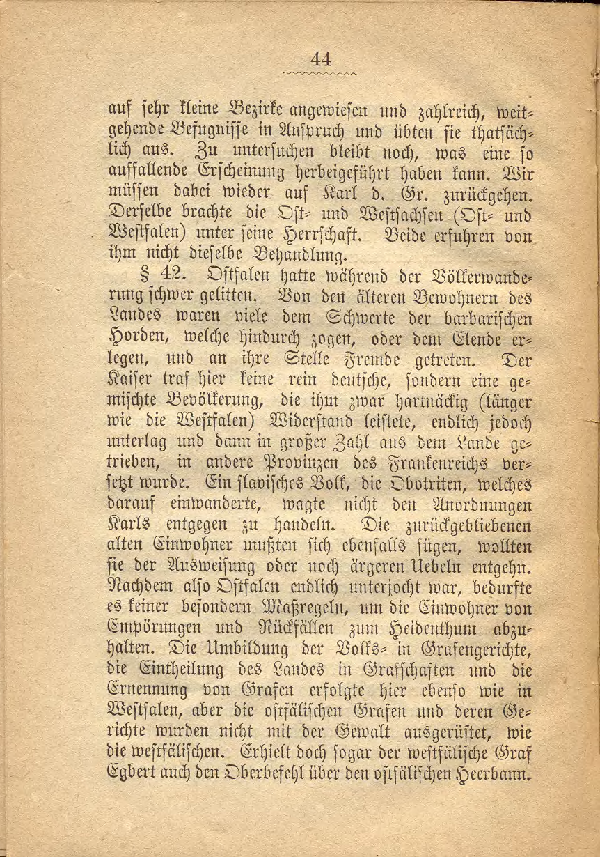§ 42. Ostfalen hatte während der Völkerwanderung schwer gelitten. Von den älteren Bewohnern des Landes waren viele dem Schwerte der barbarischen Horden, welche hindurch zogen, oder dem Elende erlegen, und an ihre Stelle Fremde getreten. Der Kaiser traf hier keine rein deutsche, sondern eine gemischte Bevölkerung, die ihm zwar hartnäckig (länger wie die Westfalen) Widerstand leistete, endlich jedoch unterlag und dann in großer Zahl aus dem Lande getrieben, in andere Provinzen des Frankenreichs versetzt wurde. Ein slavisches Volk, die Obotriten[GWR 1], welches darauf einwanderte, wagte nicht den Anordnungen Karls entgegen zu handeln. Die zurückgebliebenen alten Einwohner mußten sich ebenfalls fügen, wollten sie der Ausweisung oder noch ärgeren Uebeln entgehn. Nachdem also Ostfalen endlich unterjocht war, bedurfte es keiner besondern Maßregeln, um die Einwohner von Empörungen und Rückfällen zum Heidenthum abzuhalten. Die Umbildung der Volks- in Grafengerichte, die Eintheilung des Landes in Grafschaften und die Ernennung von Grafen erfolgte hier ebenso wie in Westfalen, aber die ostfälischen Grafen und deren Gerichte wurden nicht mit der Gewalt ausgerüstet, wie die westfälischen. Erhielt doch sogar der westfälische Graf Egbert auch den Oberbefehl über den ostfälischen Heerbann.