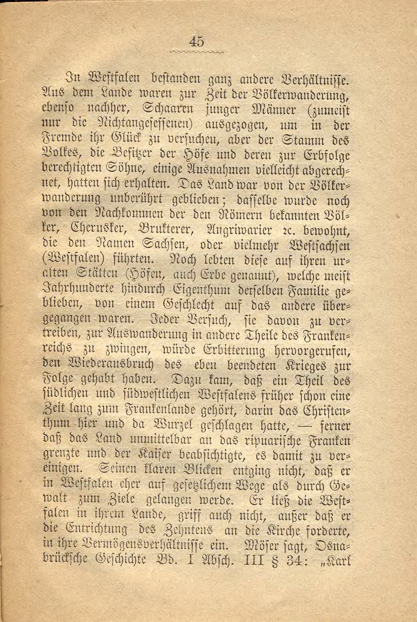 In Westfalen bestanden ganz andere Verhältnisse. Aus dem Lande waren zur Zeit der Völkerwanderung, ebenso nachher, Schaaren junger Männer (zumeist nur die Nichtangesessenen) ausgezogen, um in der Fremde ihr Glück zu versuchen, aber der Stamm des Volkes, die Besitzer der Höfe und deren zur Erbfolge berechtigten Söhne, einige Ausnahmen vielleicht abgerechnet, hatten sich erhalten. Das Land war von der Völkerwanderung unberührt geblieben; dasselbe wurde noch von den Nachkommen der den Römern bekannten Völker, Cherusker[GWR 1], Brukterer[GWR 2], Angriwarier[GWR 3] etc. bewohnt, die den Namen Sachsen, oder vielmehr Westsachsen (Westfalen) führten. Noch lebten diese auf ihren uralten Stätten (Höfen, auch Erbe genannt), welche meist Jahrhunderte hindurch Eigenthum derselben Familie geblieben, von einem Geschlecht auf das andere übergegangen waren. Jeder Versuch, sie davon zu vertreiben, zur Auswanderung in andere Theile des Frankenreichs zu zwingen, würde Erbitterung hervorgerufen, den Wiederausbruch des eben beendeten Krieges zur Folge gehabt haben. Dazu kam, daß ein Theil des südlichen und südwestlichen Westfalens früher schon eine Zeit lang zum Frankenlande gehört, darin das Christenthum hier und da Wurzel geschlagen hatte, – ferner daß das Land unmittelbar an das ripuarische Franken[GWR 4] grenzte und der Kaiser beabsichtigte, es damit zu vereinigen. Seinen klaren Blicken entging nicht, daß er in Westfalen eher auf gesetzlichem Wege als durch Gewalt zum Ziele gelangen werde. Er ließ die Westfalen in ihrem Lande, griff auch nicht, außer daß er die Entrichtung des Zehntens an die Kirche forderte, in ihre Vermögensverhältnisse ein. Möser sagt, Osnabrücksche Geschichte Bd. I Absch. III § 34: „Karl