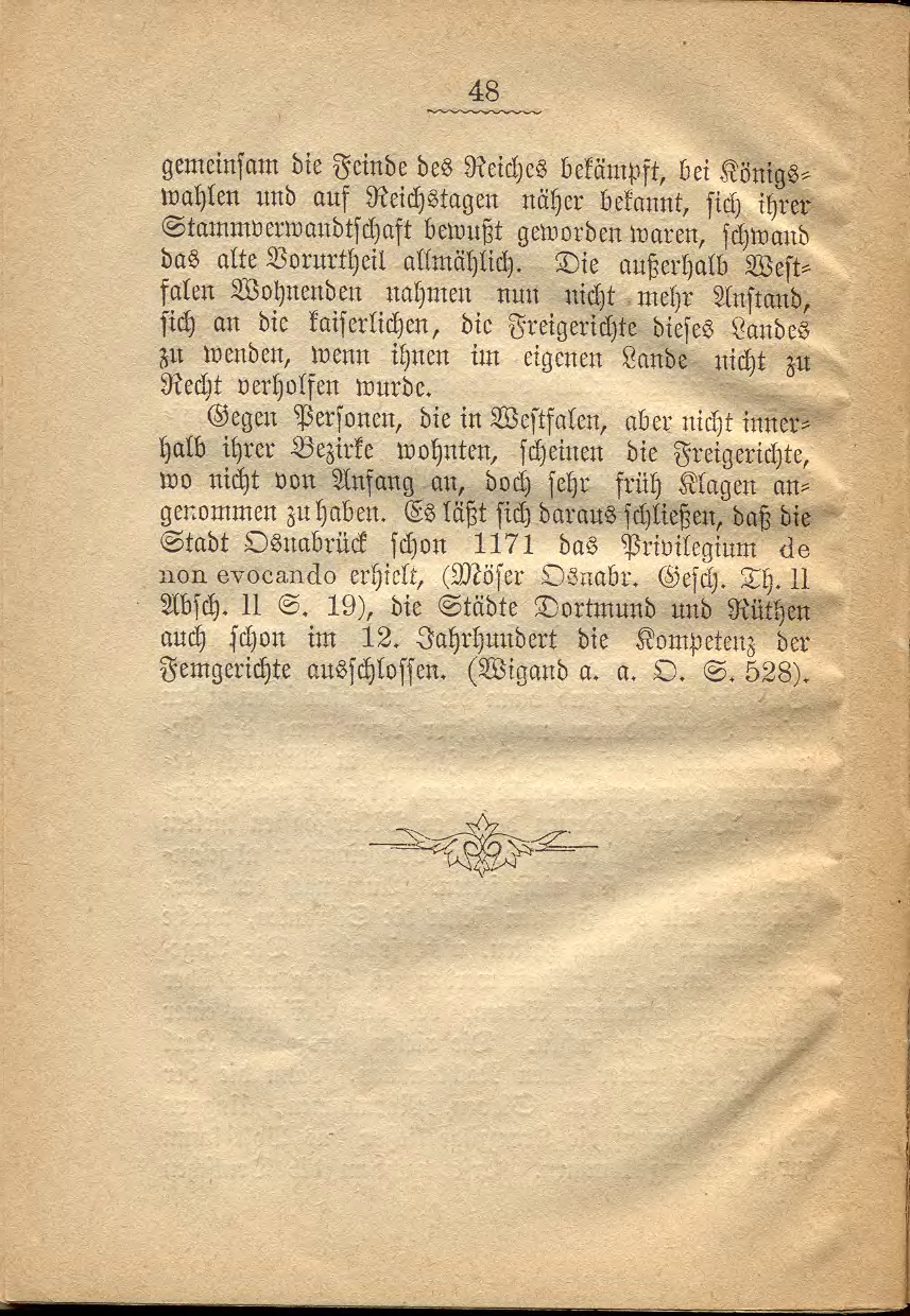 Gegen Personen, die in Westfalen, aber nicht innerhalb ihrer Bezirke wohnten, scheinen die Freigerichte, wo nicht von Anfang an, doch sehr früh Klagen angenommen zu haben. Es läßt sich daraus schließen, daß die Stadt Osnabrück schon 1171 das Privilegium de non evocando erhielt, (Möser Osnabr. Gesch. Th. II Absch. II S. 19), die Städte Dortmund und Rüthen auch schon im 12. Jahrhundert die Kompetenz der Femgerichte ausschlossen. (Wigand a. a. O. S. 528).