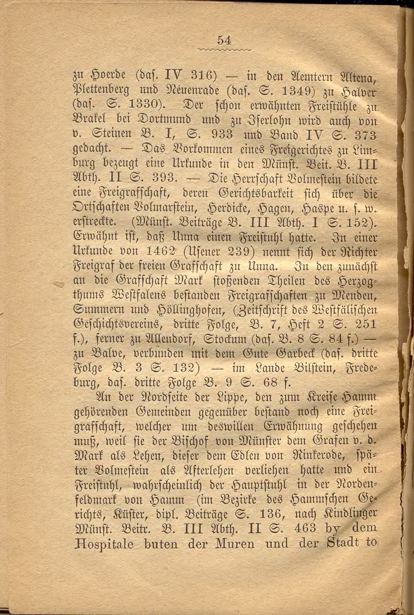 zu Hoerde (das. IV 316) – in den Aemtern Altena, Plettenberg und Neuenrade (das. S. 1349) zu Halver (das. S. 1330). Der schon erwähnten Freistühle zu Brakel bei Dortmund und zu Iserlohn wird auch von v. Steinen B. I, S. 933 und Band IV S. 373 gedacht. – Das Vorkommen eines Freigerichtes zu Limburg bezeugt eine Urkunde in den Münst. Beit. B. III Abth. II S. 393. – Die Herrschaft Volmestein bildete eine Freigrafschaft, deren Gerichtsbarkeit sich über die Ortschaften Volmarstein, Herdicke, Hagen, Haspe u. s. w. erstreckte. (Münst. Beiträge B. III Abth. I S. 152). Erwähnt ist, daß Unna einen Freistuhl hatte. In einer Urkunde von 1462 (Usener 239) nennt sich der Richter Freigraf der freien Grafschaft zu Unna. In den zunächst an die Grafschaft Mark stoßenden Theilen des Herzogthums Westfalen bestanden Freigrafschaften zu Menden, Summern und Höllinghofen, (Zeitschrift des Westfälischen Geschichtsvereins, dritte Folge, B. 7, Heft 2 S. 251 f.), ferner zu Allendorf, Stockum (das. B. 8 S. 84 f.) – zu Balve, verbunden mit dem Gute Garbeck (das. dritte Folge B. 3 S. 132) – im Lande Bilstein, Fredeburg, das. dritte Folge B. 9 S. 68 f.