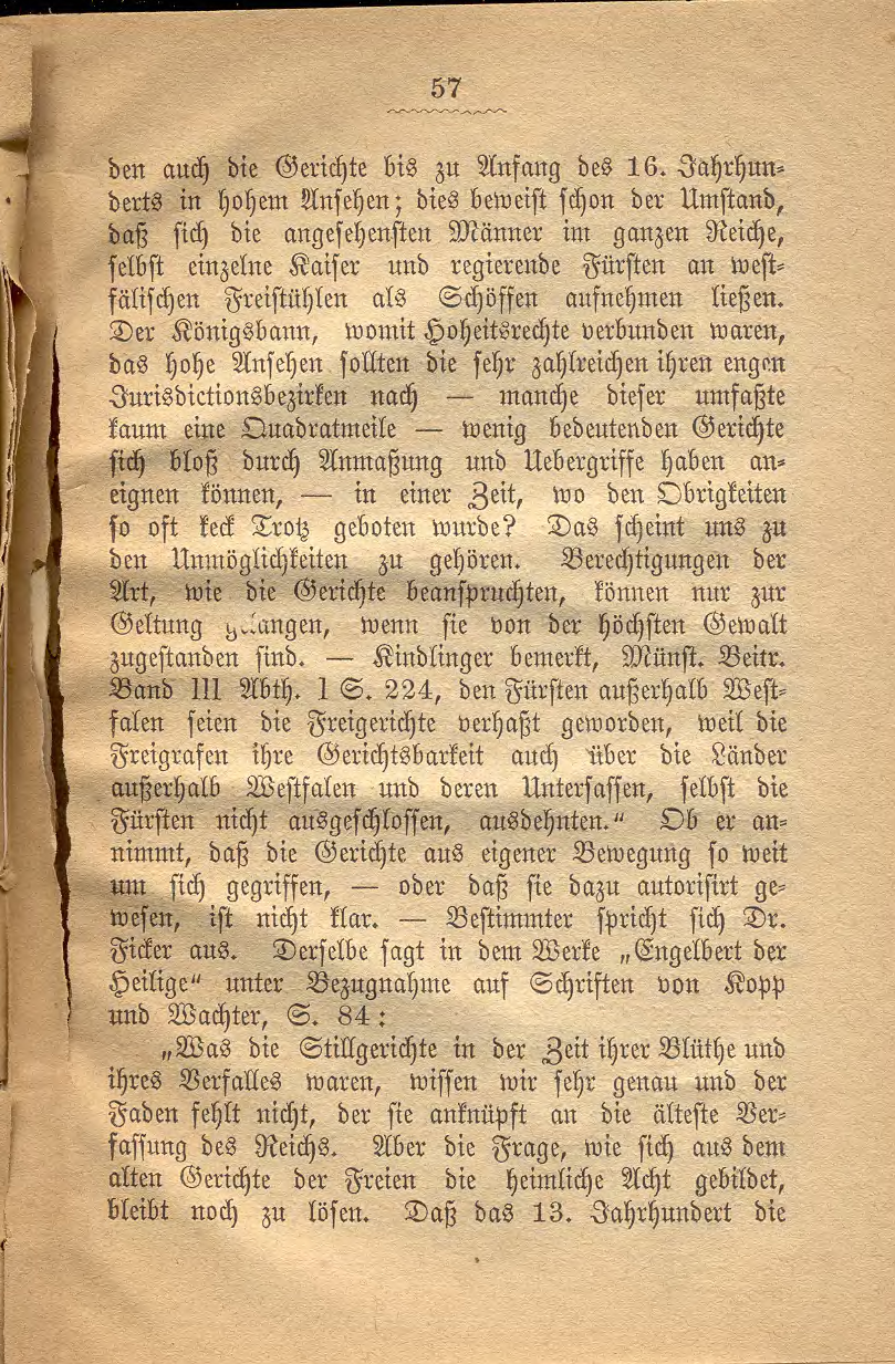 auch die Gerichte bis zu Anfang des 16. Jahrhunderts in hohem Ansehen; dies beweist schon der Umstand, daß sich die angesehensten Männer im ganzen Reiche, selbst einzelne Kaiser und regierende Fürsten an westfälischen Freistühlen als Schöffen aufnehmen ließen. Der Königsbann, womit Hoheitsrechte verbunden waren, das hohe Ansehen sollten die sehr zahlreichen ihren engen Jurisdictionsbezirken nach – manche dieser umfaßte kaum eine Quadratmeile – wenig bedeutenden Gerichte sich bloß durch Anmaßung und Uebergriffe haben aneignen können, – in einer Zeit, wo den Obrigkeiten so oft keck Trotz geboten wurde? Das scheint uns zu den Unmöglichkeiten zu gehören. Berechtigungen der Art, wie die Gerichte beanspruchten, können nur zur Geltung gelangen, wenn sie von der höchsten Gewalt zugestanden sind. – Kindlinger bemerkt, Münst. Beitr. Band III Abth. I S. 224, den Fürsten außerhalb Westfalen seien „[GWR 1]die Freigerichte verhaßt geworden, weil die Freigrafen ihre Gerichtsbarkeit auch über die Länder außerhalb Westfalen und deren Untersassen, selbst die Fürsten nicht ausgeschlossen, ausdehnten.“ Ob er annimmt, daß die Gerichte aus eigener Bewegung so weit um sich griffen, – oder daß sie dazu autorisirt gewesen, ist nicht klar. – Bestimmter spricht sich Dr. Ficker aus. Derselbe sagt in dem Werke „Engelbert der Heilige“ unter Bezugnahme auf Schriften von Kopp und Wachter S. 84:
