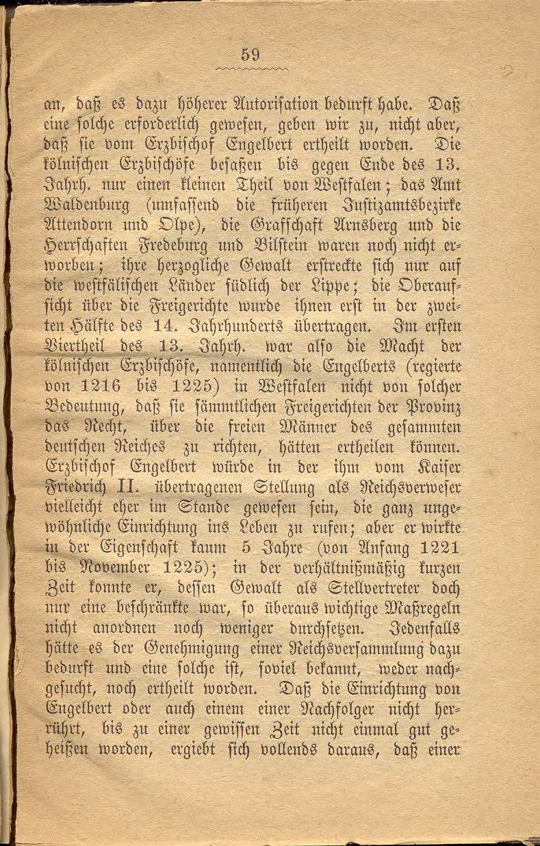 an, daß es dazu höherer Autorisation bedurft habe. Daß eine solche erforderlich gewesen, geben wir zu, nicht aber, daß sie vom Erzbischof Engelbert ertheilt worden. Die kölnischen Erzbischöfe besaßen bis gegen Ende des 13. Jahrh. nur einen kleinen Theil von Westfalen; das Amt Waldenburg (umfassend die früheren Justizamtsbezirkde Attendorn und Olpe), die Grafschaft Arnsberg und die Herrschaften Fredeburg und Bilstein waren noch nicht erworben; ihre herzogliche Gewalt erstreckte sich nur auf die westfälischen Länder südlich der Lippe; die Oberaufsicht über die Freigerichte wurde ihnen erst in der zweiten Hälfte des 14. Jahrhunderts übertragen. Im ersten Viertheil des 13. Jahrh. war also die Macht der kölnischen Erzbischöfe, namentlich die Engelberts (regierte von 1216 bis 1225) in Westfalen nicht von solcher Bedeutung, daß sie sämmtlichen Freigerichten der Provinz das Recht, über die freien Männer des gesammten deutschen Reiches zu richten, hätten ertheilen können. Erzbischof Engelbert würde in der ihm vom Kaiser Friedrich II. übertragenen Stellung als Reichsverweser vielleicht eher im Stande gewesen sein, die ganz ungewöhnliche Einrichtung ins Leben zu rufen; aber er wirkte in der Eigenschaft kaum 5 Jahre (von Anfang 1221 bis November 1225); in der verhältnißmäßig kurzen Zeit konnte er, dessen Gewalt als Stellvertreter doch nur eine beschränkte war, so überaus wichtige Maßregeln nicht anordnen noch weniger durchsetzen. Jedenfalls hätte es der Genehmigung einer Reichsversammlung dazu bedurft und eine solche ist, soviel bekannt, weder nachgesucht, noch ertheilt worden. Daß die Einrichtung von Engelbert oder auch einem seiner[GWR 1] Nachfolger nicht herrührt, bis zu einer gewissen Zeit nicht einmal gut geheißen worden, ergiebt sich vollends daraus, daß einer