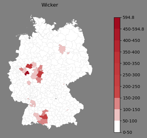 Relative Verteilung des Namens Wicker (1996)Direkt zur Karte Die Farbskala zeigt die Anzahl von "Wicker" bezogen auf je 1 Million Einträge. |