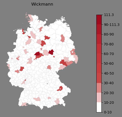 Relative Verteilung des Namens Wickmann (1996)Direkt zur Karte Die Farbskala zeigt die Anzahl von "Wickmann" bezogen auf je 1 Million Einträge. |