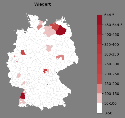 Relative Verteilung des Namens Wiegert (1996)Direkt zur Karte Die Farbskala zeigt die Anzahl von "Wiegert" bezogen auf je 1 Million Einträge. |