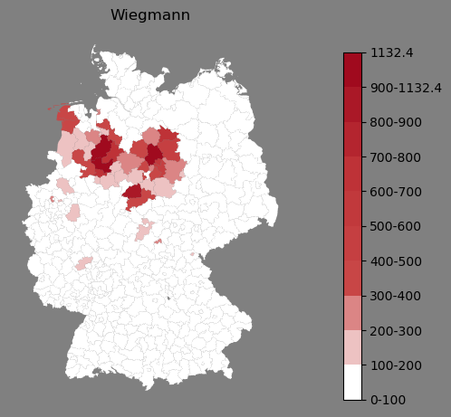 Relative Verteilung des Namens Wiegmann (1996)Direkt zur Karte Die Farbskala zeigt die Anzahl von "Wiegmann" bezogen auf je 1 Million Einträge. |